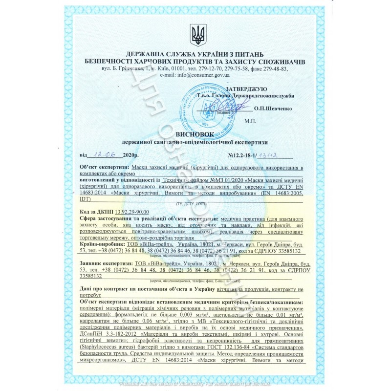 Сертифікована в Україні та згідно висновку державної санітарно-епідеміологічної експертизи України відповідає вимогам ДСТУ EN 14683:2014 Маски хірургічні.